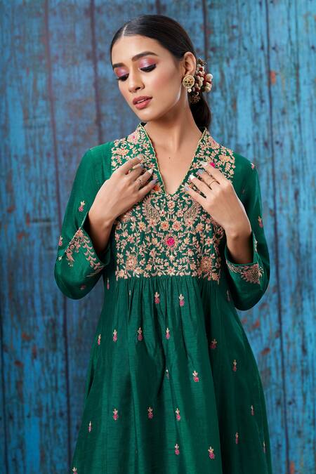 Green Silk Floral, Paisley V Neck Embroidered Kurta And Palazzo Set