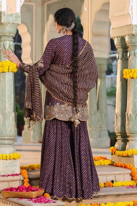 Purple kurta featuring all over floret butti prints and floral, zardozi embroidery. Paired with a coordinating sharara and leheriya print dupatta.