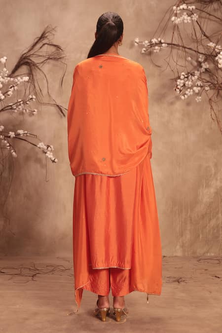 Orange yoke embroidered kurta featuring a flowy silhouette and intricate detailing. Paired with matching pant in Chiniya silk fabric.