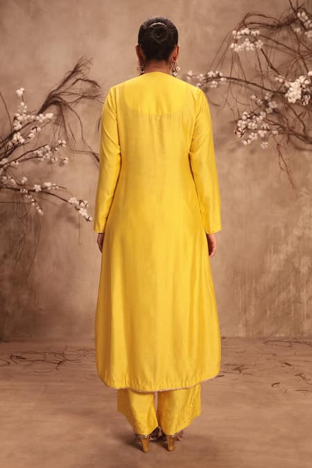 Yellow Silk Embroidery Notched Neck Yoke Kurta With Pant