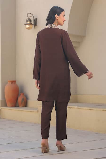 Brown tunic featuring zardozi and resham embroidered neckline. Paired with matching pant showcasing similar embroidery details.