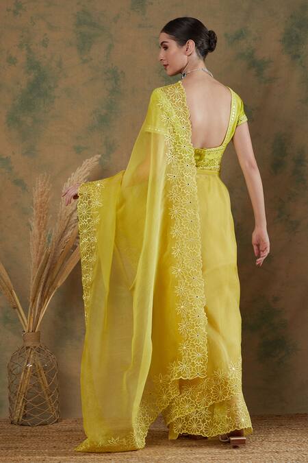 Yellow silk organza saree featuring thread embroidered borders. Paired with a mirror embroidered chanderi blouse with a square neckline and half sleeves.