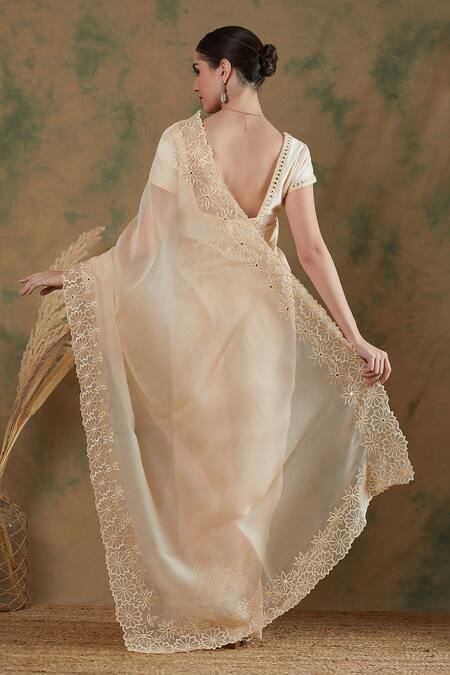 Ivory silk organza saree featuring thread embroidered borders. Accompanied by a mirror embroidered chanderi blouse with a square neckline and half sleeves.