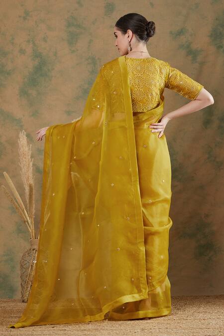 Golden yellow silk organza saree featuring floral and mirror embroidery. Paired with a matching thread embroidered blouse with a V neck and half sleeves.