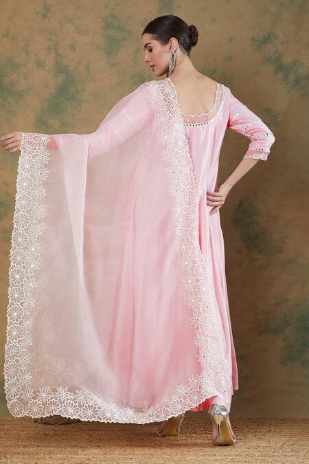 Baby pink chanderi anarkali featuring a scalloped neckline and three-quarter sleeves with floral and mirror embroidery. Paired with a silk organza dupatta showcasing floral geometric work.