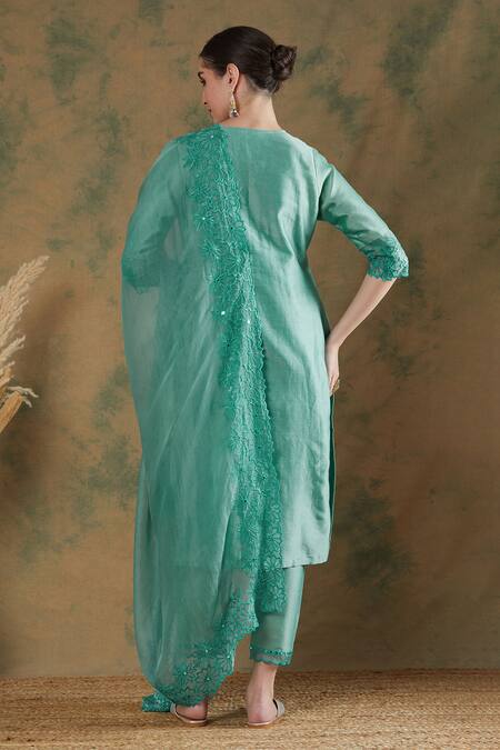 Steel blue chanderi kurta featuring a scalloped neckline and three-quarter sleeves with floral and mirror embroidery. Paired with a silk organza dupatta and matching pants, showcasing intricate floral geometric work.