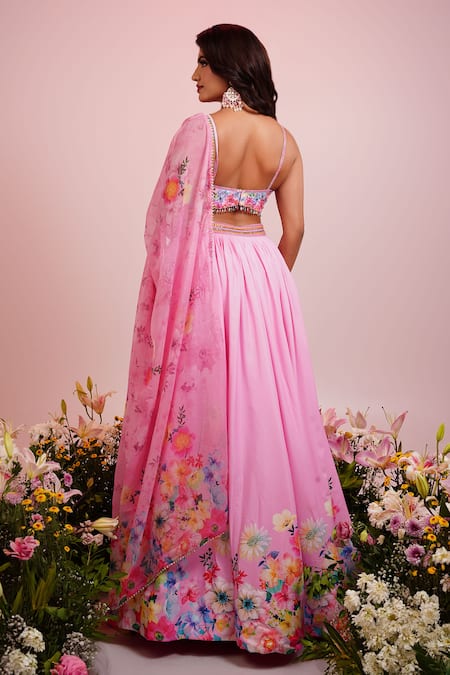 Pink lehenga featuring floral print on the ghera hem and hand embroidered waistband. Paired with a padded blouse and a printed dupatta.