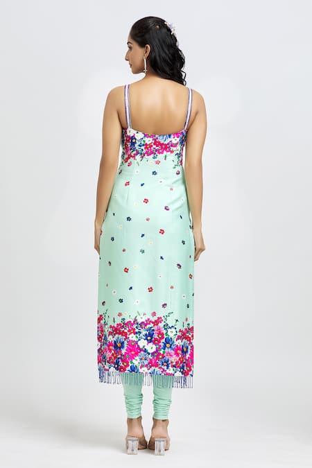 Green kurta featuring floral print with bead and cutdana embroidery. Paired with matching legging and embellished dupatta.