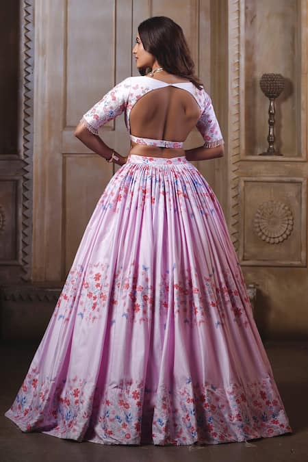 Pink lehenga featuring tiny floral and butterfly prints with a hand embroidered padded blouse. Paired with an ombre dupatta and includes a back cutout design and tassel hem sleeves.