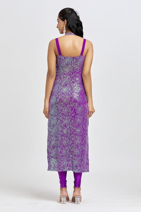 Purple kurta featuring a sweetheart neckline with all-over sequin floral embroidery. Paired with a matching legging and dupatta.