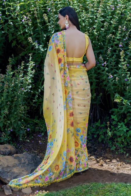 Yellow pre-draped saree featuring floral, butterfly, and sunflower prints. Paired with a padded, backless blouse with a plunge neckline.