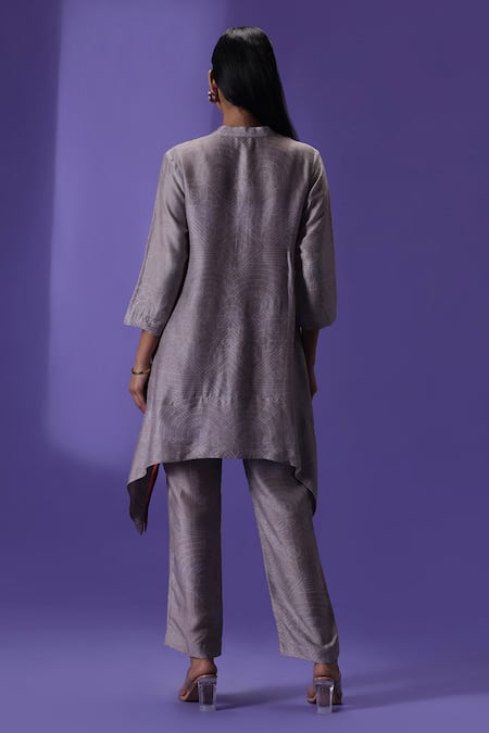 Pink dupion silk kurta featuring a unique geometric print with high-low hem. Paired with matching pant in a complementary design.