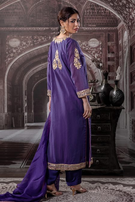 Purple kurta featuring gota, zari, and sequins hand embroidery. Paired with an embroidered salwar and a dupatta.