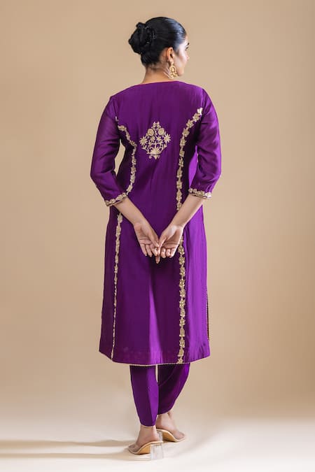 Purple Chanderi Sequins Round Neck Kashmiri Tilla Embroidered Kurta Dhoti Set