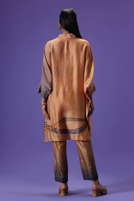 Peach dupion silk kurta featuring a printed design with a collar and oversized silhouette. Paired with matching printed pants that complement the kurta's style.
