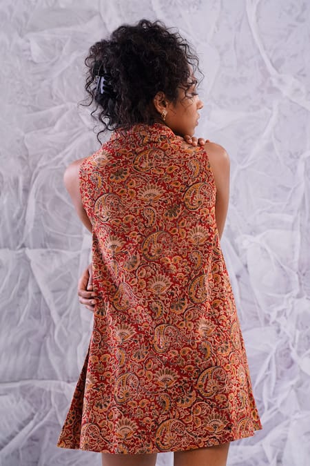 Buy_Label Rama_Red Cotton Hand Block Print Paisley Cowl Neck Short Dress_at_Aza_Fashions