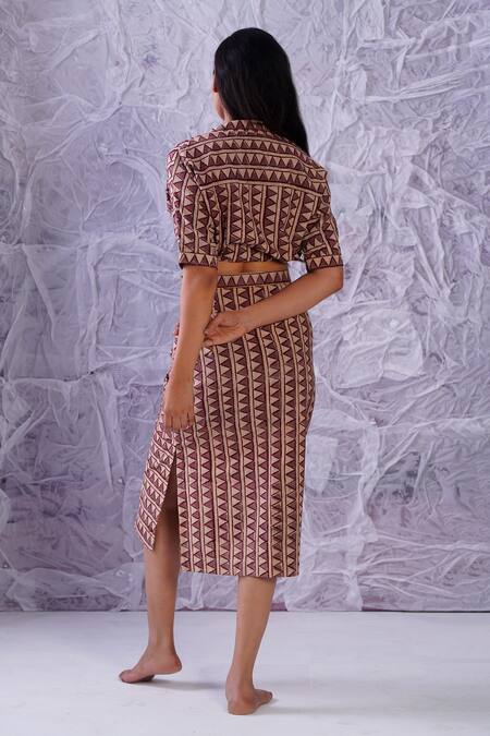 Front tie-up detailing on crop top, Geometric hand block print design, Pencil skirt with side slit