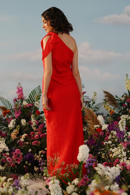 Red Silk Plain Asymmetric Hitachi Seaside One Shoulder Dress
