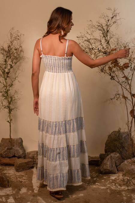 Buy_Label Reyya_White Cotton, Rayon Tassels, Sequins V-neck Chevron Print Panelled Dress_at_Aza_Fashions
