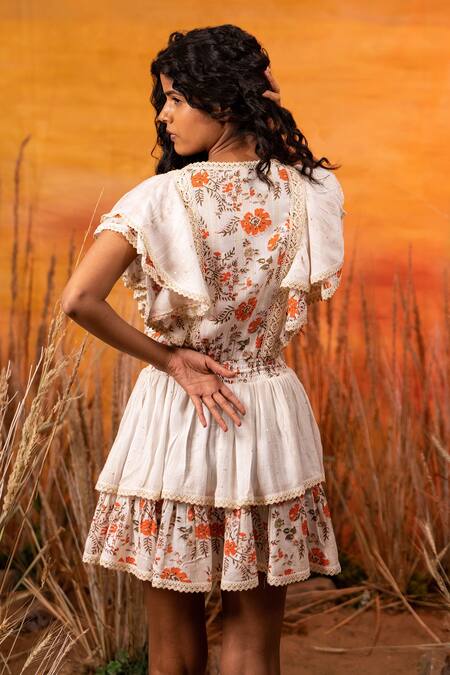 White rayon lurex tiered dress with floral print panels, surplice neck, flutter sleeves, crochet lace & sequin work embellishment.