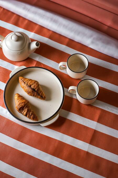 Off white ceramic kettle with contrast piping. Comes along with 2 matching cups and one platter.