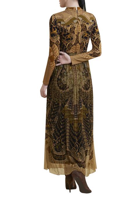 Buy_Label Ritu Kumar_Gold Chiffon, Viscose Mandarin Collar Printed Maxi Dress_Online_at_Aza_Fashions