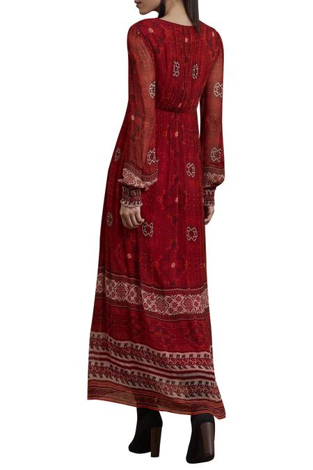 Buy_Label Ritu Kumar_Red Chiffon, Viscose V Neck Printed Maxi Dress_Online_at_Aza_Fashions