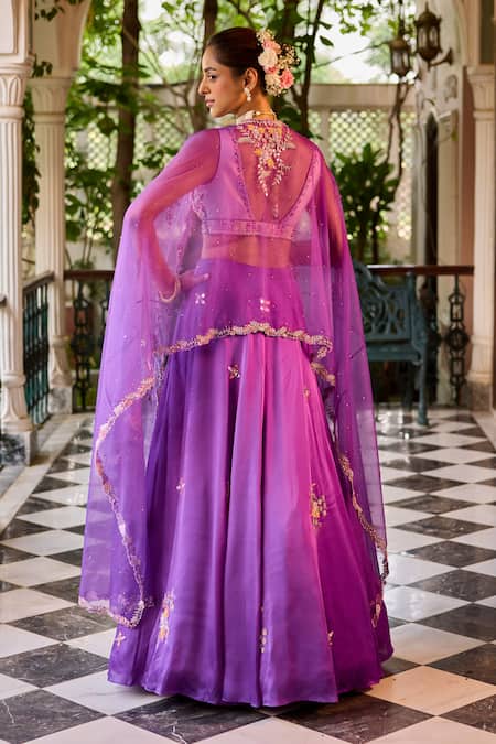 Purple lehenga set featuring a floral hand embroidered blouse with sequin, bead, and pearl detailing. The set includes a matching dupatta and an attached cancan lehenga, enhancing the overall elegance.