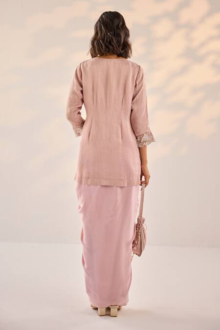 Pink Organza, Crepe, Cotton Embroidery Florence Striped Kurti With Draped Skirt