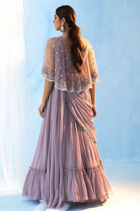 Purple hand embroidered lehenga saree featuring a padded blouse and a flared cape. The ensemble includes a raw silk belt and showcases intricate cutdana, sequins, and pearls work.