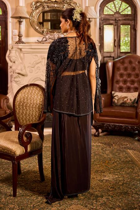 Black pre-draped saree featuring hand-embroidered bead and pearl work on the hem. Paired with a padded blouse and an open mesh cape adorned with intricate embroidery.