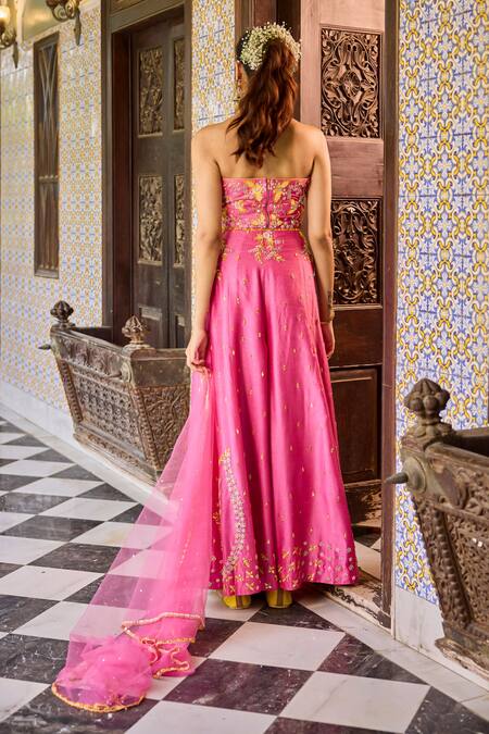 Pink hand embroidered top featuring floral design with thread, mirror, sequin, and pearl work. Paired with an embroidered sharara and a scallop hem dupatta.