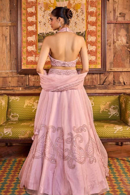 Onion pink lehenga featuring hand embroidered paisley motif with sequin and glass bead work. Paired with an embroidered waistcoat blouse and a matching dupatta.