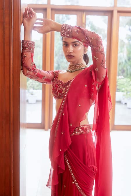 Fuchsia pink pre-draped saree with multi-layers, hand embroidery at the border and ruffle hem. Comes with embellished blouse.