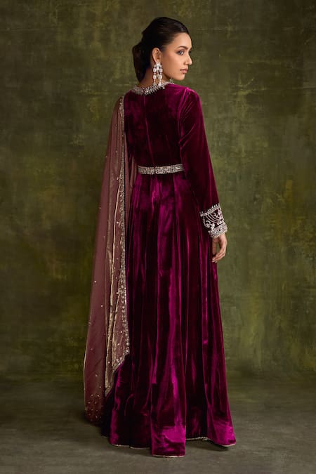 Purple anarkali featuring sequin bead & cutdana hand embroidery in floral pattern. Paired with a cheeta sequin embroidered dupatta with satin border.