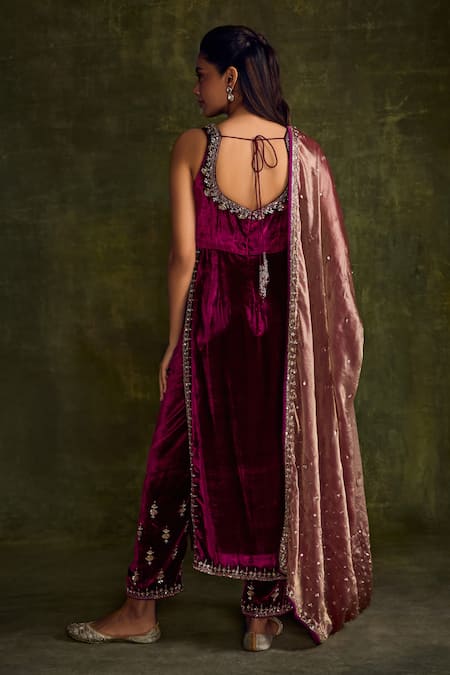 Purple straight kurta in silk velvet featuring hand embroidery with sequin, bead, and cutdana floral patterns. Paired with floral booti embroidered pants and a dupatta with cheeta sequin embroidery and satin border.