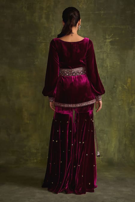 Purple peplum kurta featuring hand embroidery with sequin, bead, and cutdana detailing. Paired with a cheeta sequin embroidered sharara and a matching waist belt.