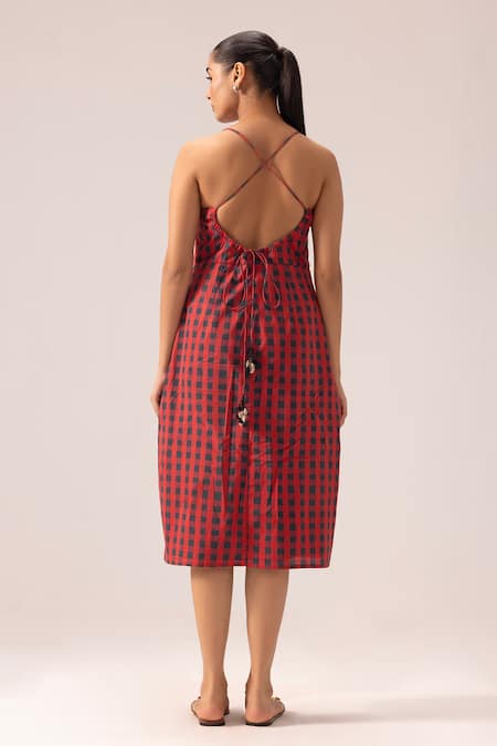 Red Cotton Sweetheart Neck Backless Handwoven Midi Dress
