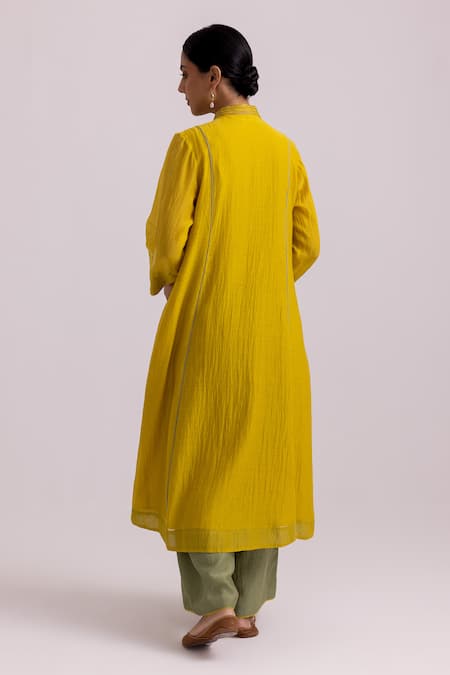 Yellow Chanderi, Kota Doria Sequins, Embroidery Collared Butti Kurta Pant Set