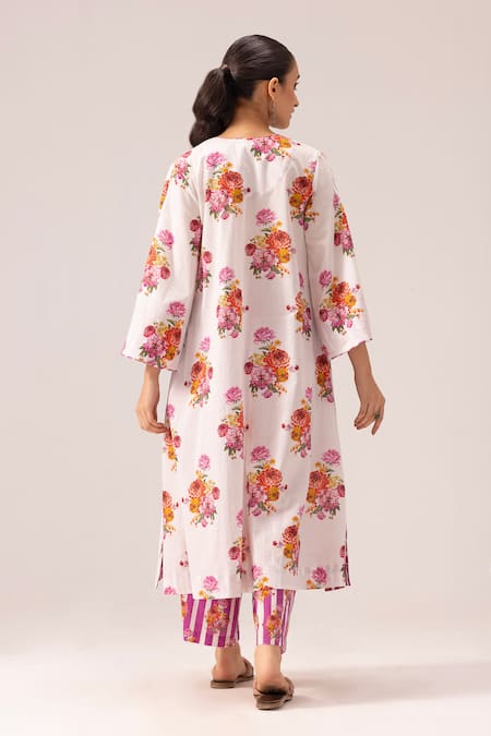 White floral print kurta featuring bell sleeves and a round neckline. Paired with matching striped cotton pants with a drawstring closure.