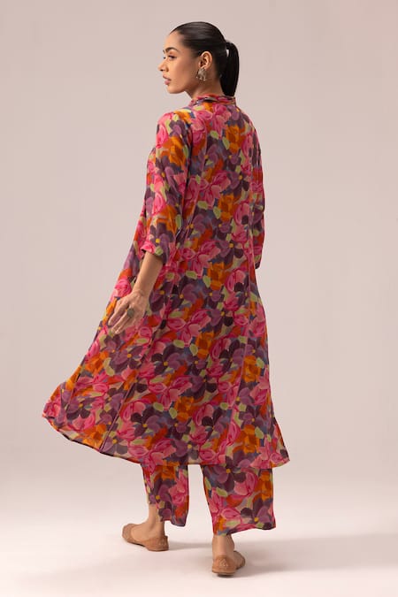 Multi color floral print kurta featuring pintuck detailing on the neck. Paired with matching crepe pants with a drawstring closure.