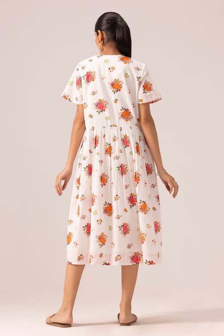 White Cotton Round Neck Floral Print Front-opening Midi Dress