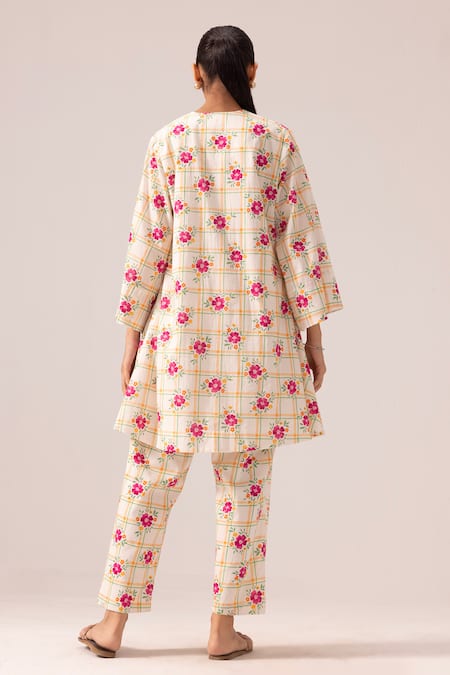 Off white kurta featuring floral print with a straight silhouette. Paired with matching printed pants.
