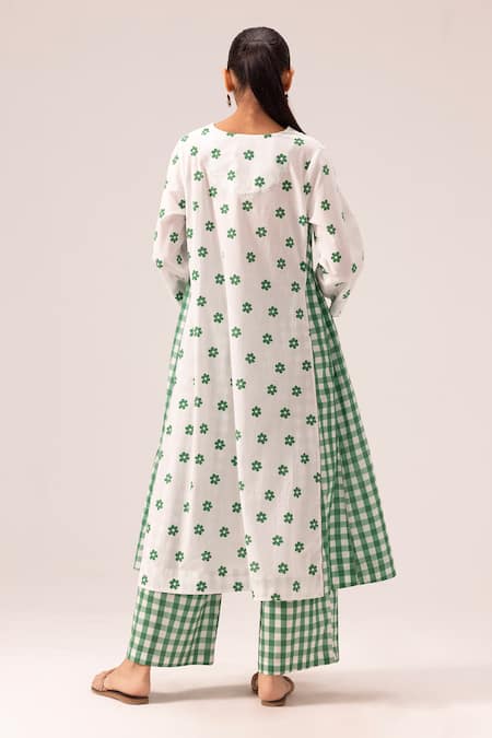 Green printed cotton choga kurta featuring contrast panel detailing and a relaxed fit. Paired with matching pants that have an elasticated back and drawstring front for comfort.