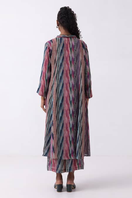 Multicolor kurta featuring ikat print, V neckline, and long sleeves. Paired with cropped flared pant for a coordinated look.
