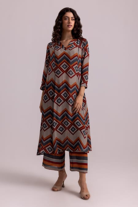 Brown Crepe V-neck Knit Pattern Kurta With Pant