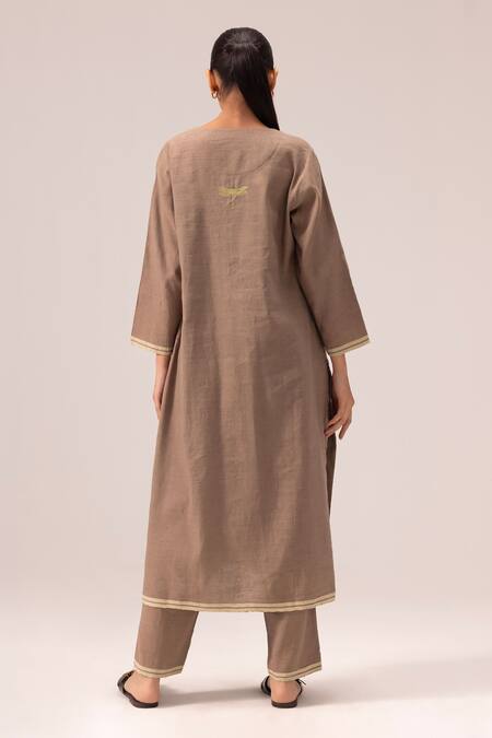 Brown handwoven linen kurta featuring a straight cut and a subtle dragonfly embroidery on the back. Paired with matching elasticated and drawstring pants for a comfortable fit.