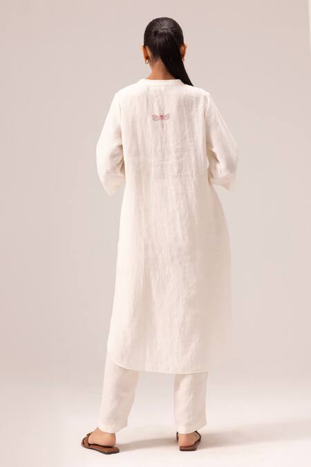 White Handloom Cotton Embroidery Collared Handwoven Linen Kurta Set