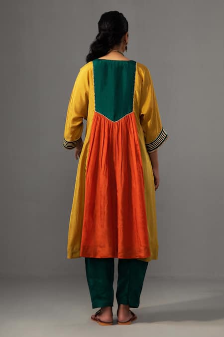 Yellow and orange silk color block panel kurta featuring gotapatti work and a round neckline. Paired with drawstring closure pants.