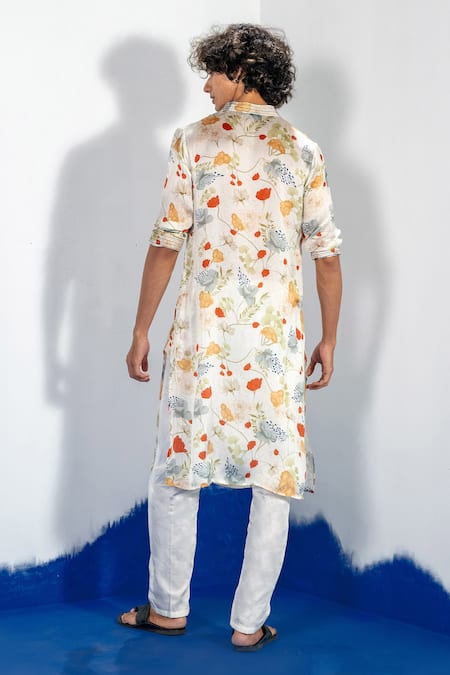 White printed kurta featuring anchoring details and a front zip closure. Paired with matching pants for a complete look.